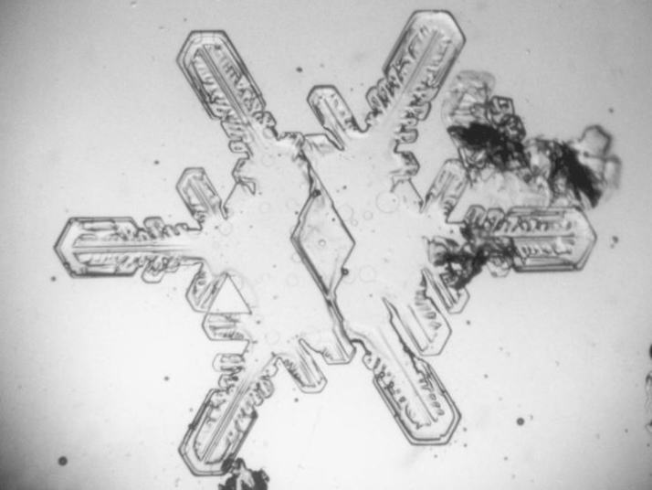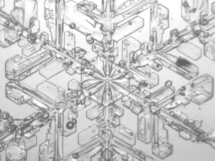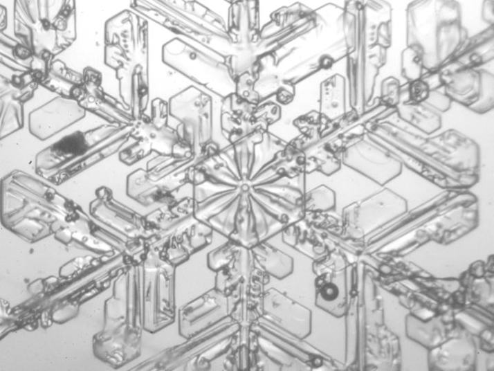 ブロック型の樹脂包埋レプリカで捉えた雪の結晶の三面観察像。
