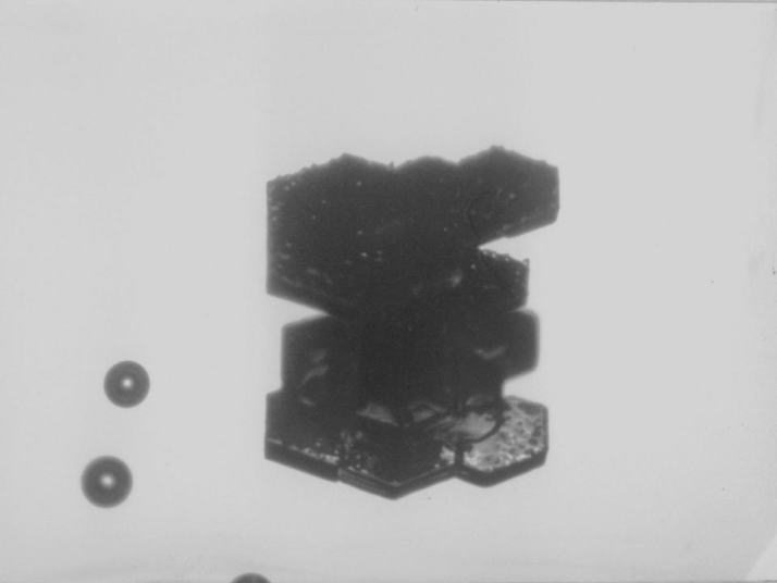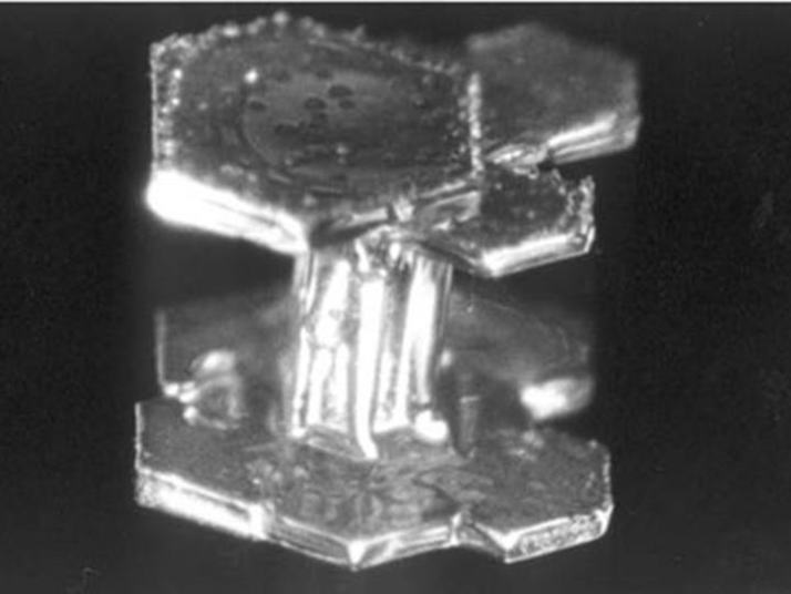 この結晶は、センターカラムの上下の底面がせり出している二重板構造で、中心付近は骸晶構造であることがわかります。結晶中心に小さな突出部があることもわかります。