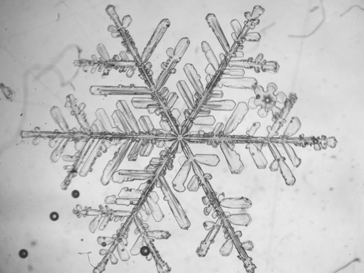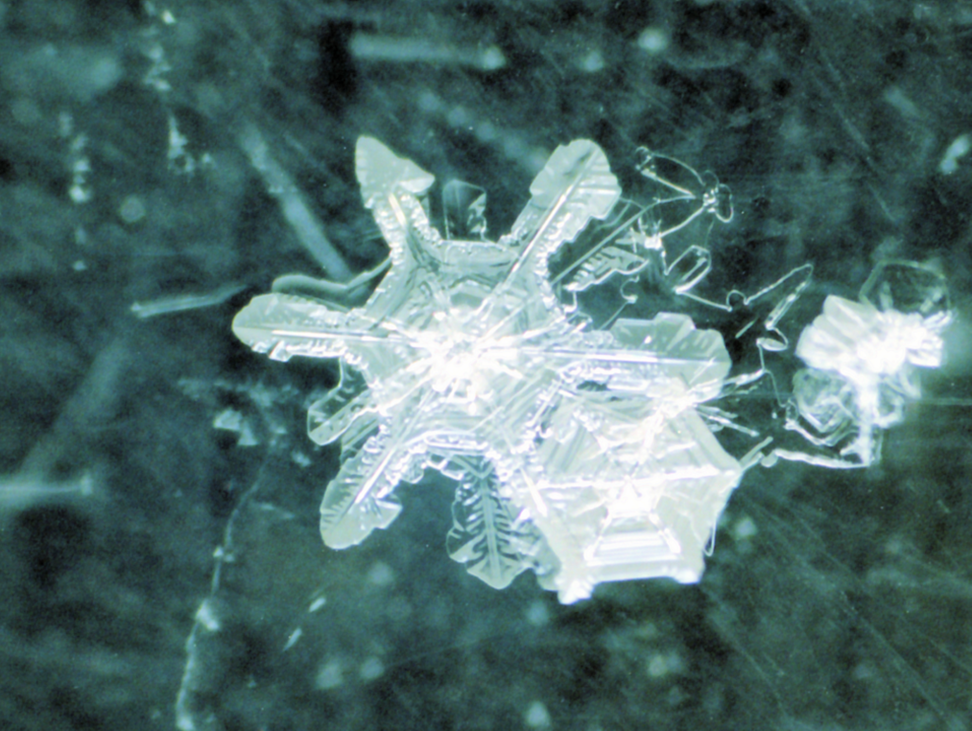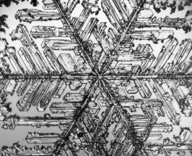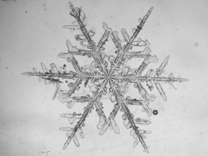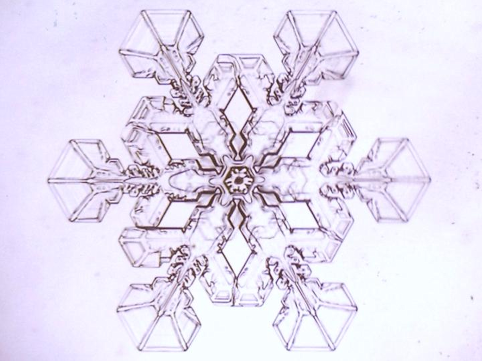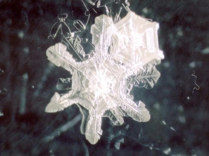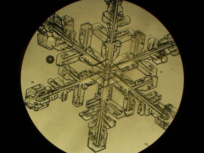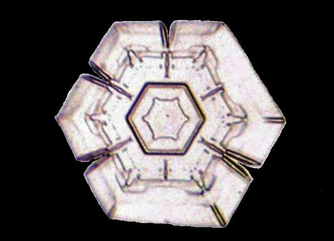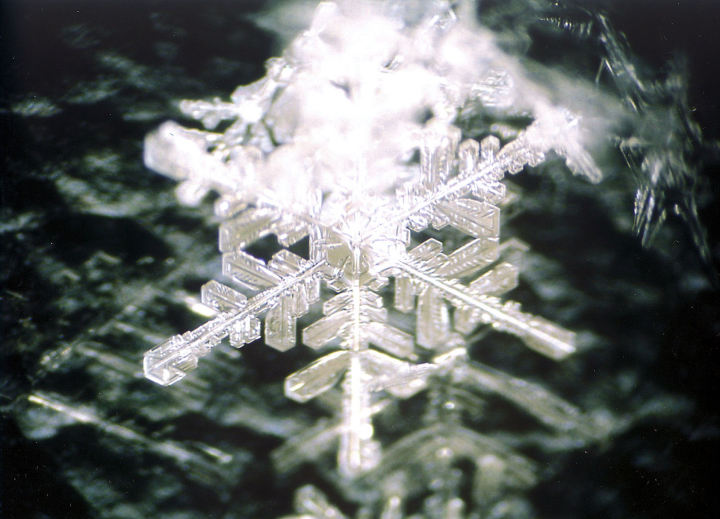 Snow crystals, like ice, are colorless and transparent, so when they are observed under a microscope, they are usually observed using transmitted light. When we observe crystals through transmitted light, we can see not only their external shape but also the surface pattern and internal structure of the crystal due to the irregularities of the crystal surface. Sometimes, beautiful symmetrical shapes can be seen in the small side branches and surface patterns, and the center of the crystal may have a very detailed structure.