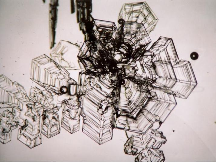 The photograph shown at the lower right is a skeleton-shaped crystal of frost. Simple crystals of this shape are rarely found in natural snow and are often combined with other crystal types (plate or columnar). However, experiments on artificial crystal growth have shown that crystals grow into this shape when there is a certain amount of water vapor in the air.
