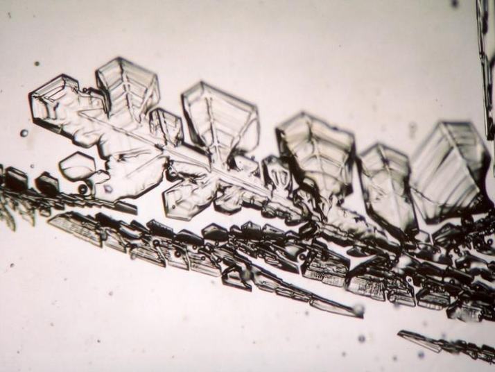 Snow crystals grow into simple shapes such as plate or columnar when the amount of water vapor in the air is low, and into complex shapes such as dendritic or needles when the amount is high 2). The skeleton-shaped crystal shown in the photograph on the lower right is the shape that grows when the amount of water vapor is in between the two conditions described above.