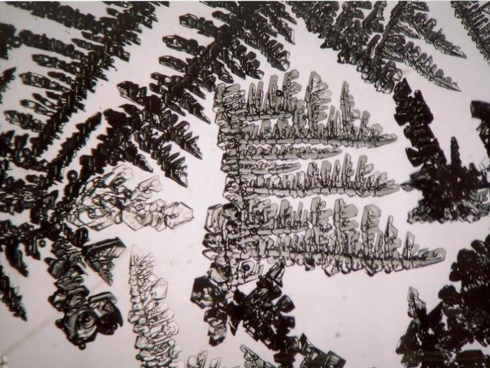 Since it is difficult to observe frost growing on a leaf or a car window directly with a microscope, I let the frost crystals grow on a transparent acrylic plate, made a replica of them, and observed it. Frost crystals observed in this way are shown below.