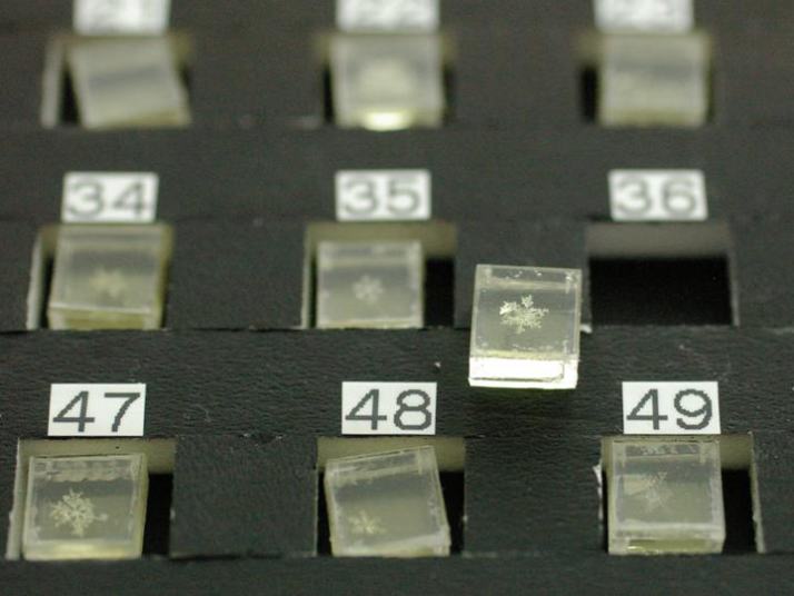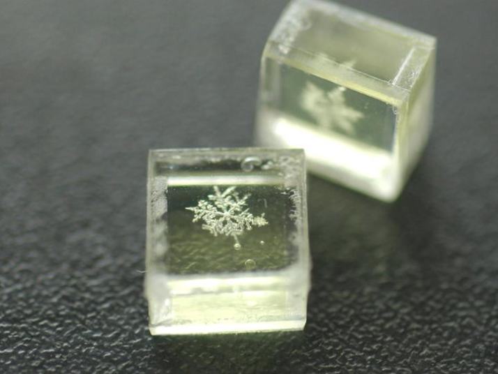 The replica of the snow crystal embedded in a resin block. The structure of snow crystals is preserved as internal voids in the resin.