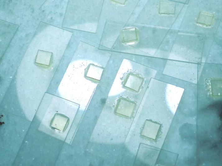 Light-curing resin is dripped onto the snow crystals, then a cover is placed over them. After the resin is cured, the water is allowed to evaporate.